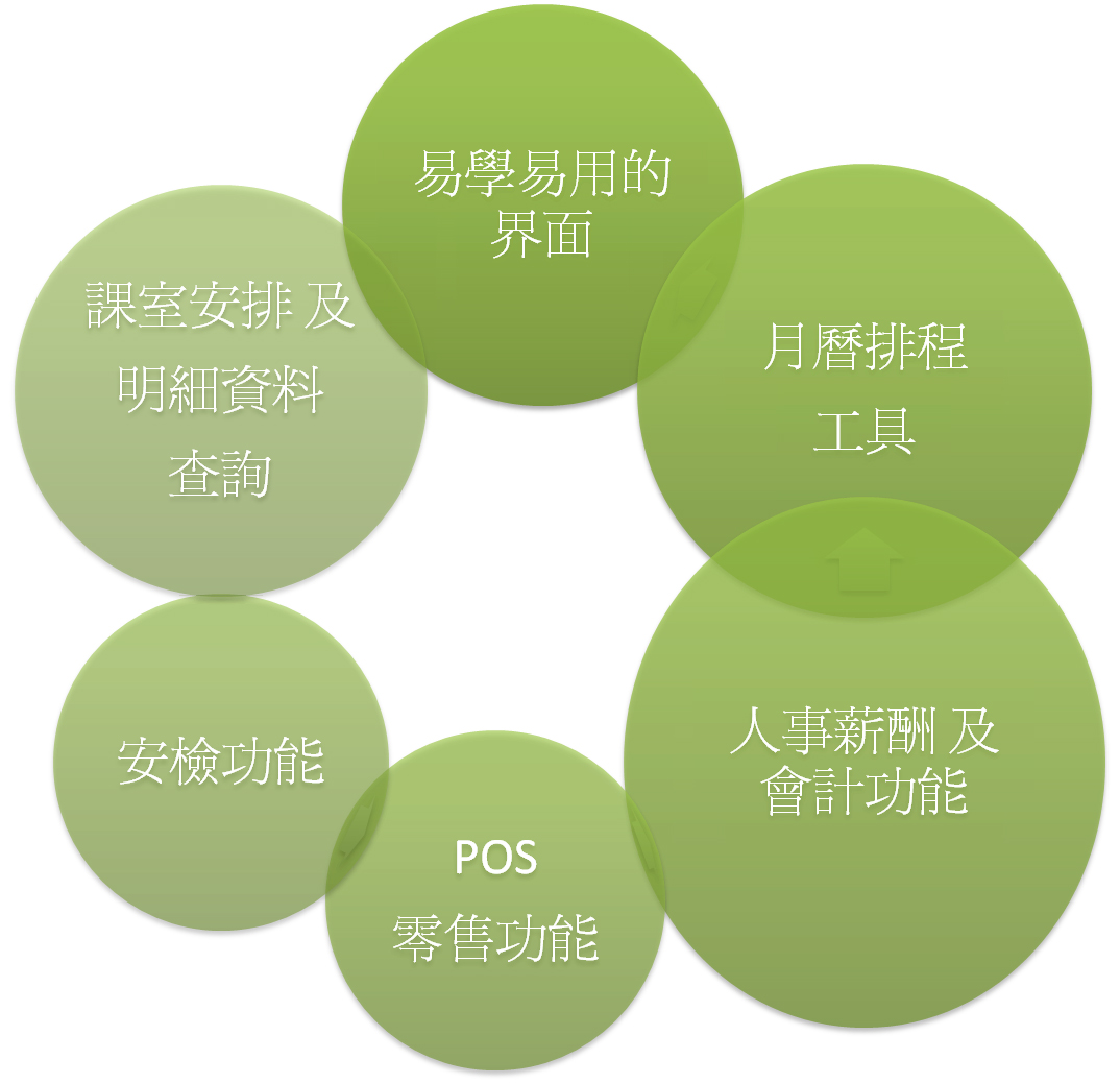 •輸入方便︰可於一個介面上輸入不同資料如課程、班別、學生及職員所有資料;亦可同時查核,以免重複,省時方便。•更大彈性︰客戶可授權及設權限與職員、教師及學生;可隨時隨地查核或更改上課資料,更有彈性。•節省資源︰此系統已幫助處理大部份工作,故更可節省人力及時間。客戶可將所節省得來的時間及金錢投放於其他方面(如推廣、發展等),增加營業額。•學生報名、轉班、學費計算